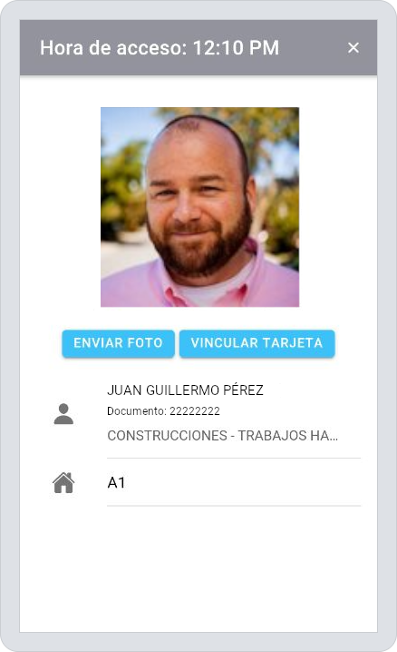 Al cliquear sobre el item del trabajador se visualizan los datos obtenidos hasta este momento, al pulsar sobre el botón "Enviar foto" se activa la cámar del teléfono permitiendo obtener una foto del trabajador, la que inmediatmente quedará asociada al perfil.
