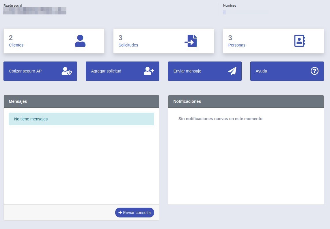 Una vez registrado y dentro del sistema, ingresarás a la primer pantalla o panel de control, que vincula a las herramientas necesarias para que puedas operar así como información sobre el estado de situación de clientes y seguros.